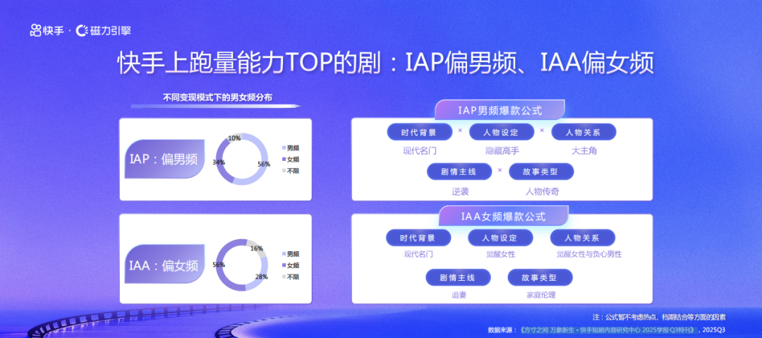 快手统计平台上跑量能力TOP的短剧后发现,在IAP模式下,用户更偏好男频短剧,爆款公式是“现代名门x隐藏高手x大主角x逆袭x人物传奇”;而在IAA模式下,用户更偏好女频短剧,爆款公式是“现代名门x觉醒女性x觉醒女性与负心男性x追妻x家庭伦理”。