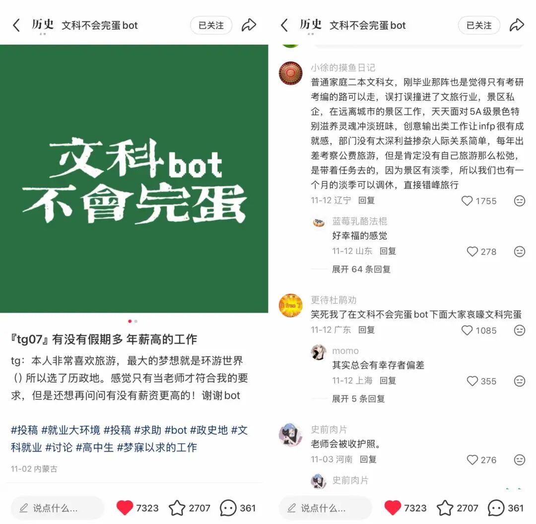 目前,“文科不会完蛋bot”在小红书拥有超8000个粉丝,不少文科生在这里抱团取暖,请教学习选专业的经验、寻找就业出路。