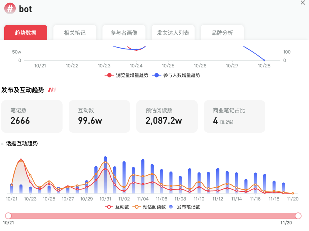 新榜旗下小红书数据工具新红显示,近30天,小红书#bot 话题新增浏览增量达1204.28万次,相关笔记预估阅读数为2087.2万次。