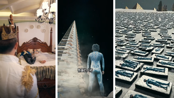 传统的经典改编,需要考虑场景还原成本高、角色演绎偏离原著等问题,而AI打破了这些限制——不用搭建真实后宫,不用复刻古典画室,不用纠结童话场景的奇幻程度,只要创意到位,皇帝送外卖、画家做咖啡、睡美人救夫这些脑洞剧情都有机会轻松实现。