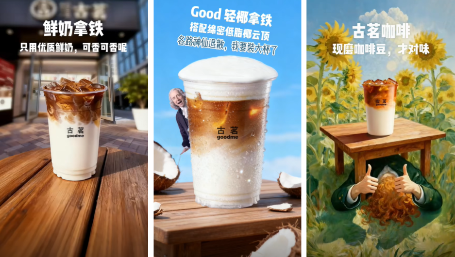 这些在历史中留下深刻印记的名人,原本与现代饮品毫无关联,却在AI的创作下,成了自带认知度的流量,并且契合品牌特性,用奶牛强调优质鲜奶、用云端强调绵密椰云、用嚼咖啡强调现磨咖啡豆,加深观众对品牌的认知。