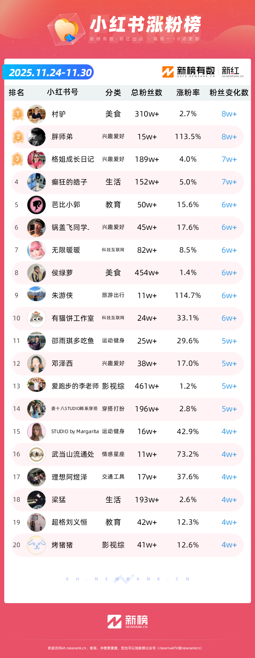 依托新榜旗下小红书数据工具“新红”,新榜推出「小红书涨粉榜」,本次统计周期为2025年11月24日到2025年11月30日。