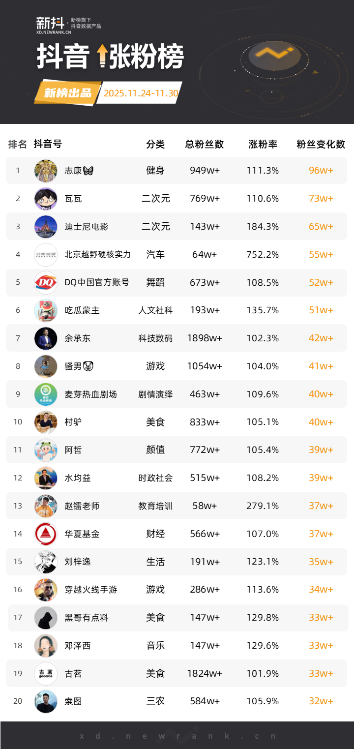 依托新榜旗下抖音数据工具“新抖”,新榜推出「抖音涨粉榜」,每周一期。本次统计周期为2025年11月24日到2025年11月30日。