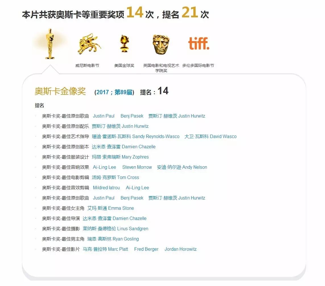 金球奖七提七中,十四个奥斯卡提名,大大小小的奖项和提名加起来有近200个(网友统计),《爱乐之城》在国际上斩获的奖项,恐怕一张A4纸都列不下。