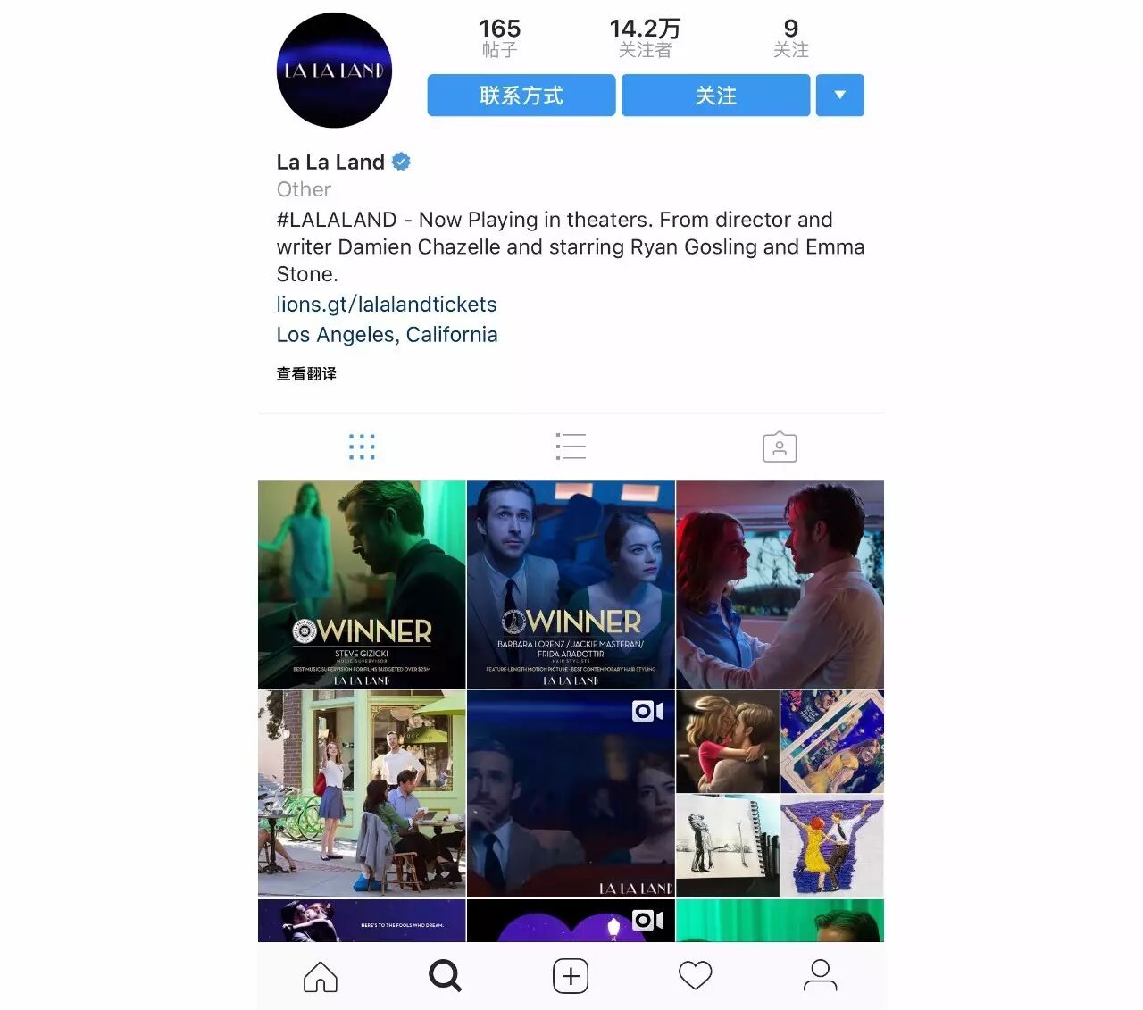 《爱乐之城》对社交媒体、新媒体的喜爱从日本限定广告中就能看出。除了大胆任用网红参与影片的宣传,《爱乐之城》还十分注重社交媒体账号的运营,《爱乐之城》早就注册了Instagram,并积极维护。