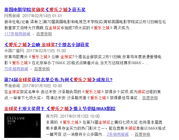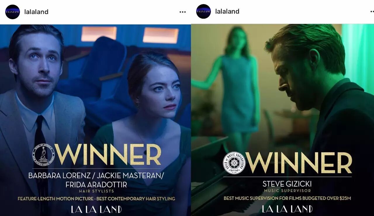 举个例子,给《爱乐之城》带来最多曝光的电影奖项有今年的第74届金球奖、第89届奥斯卡,这两个奖项的全球知名度很高,宣传力度也很大。作为这两个奖的获奖热门,《爱乐之城》必定星光熠熠。