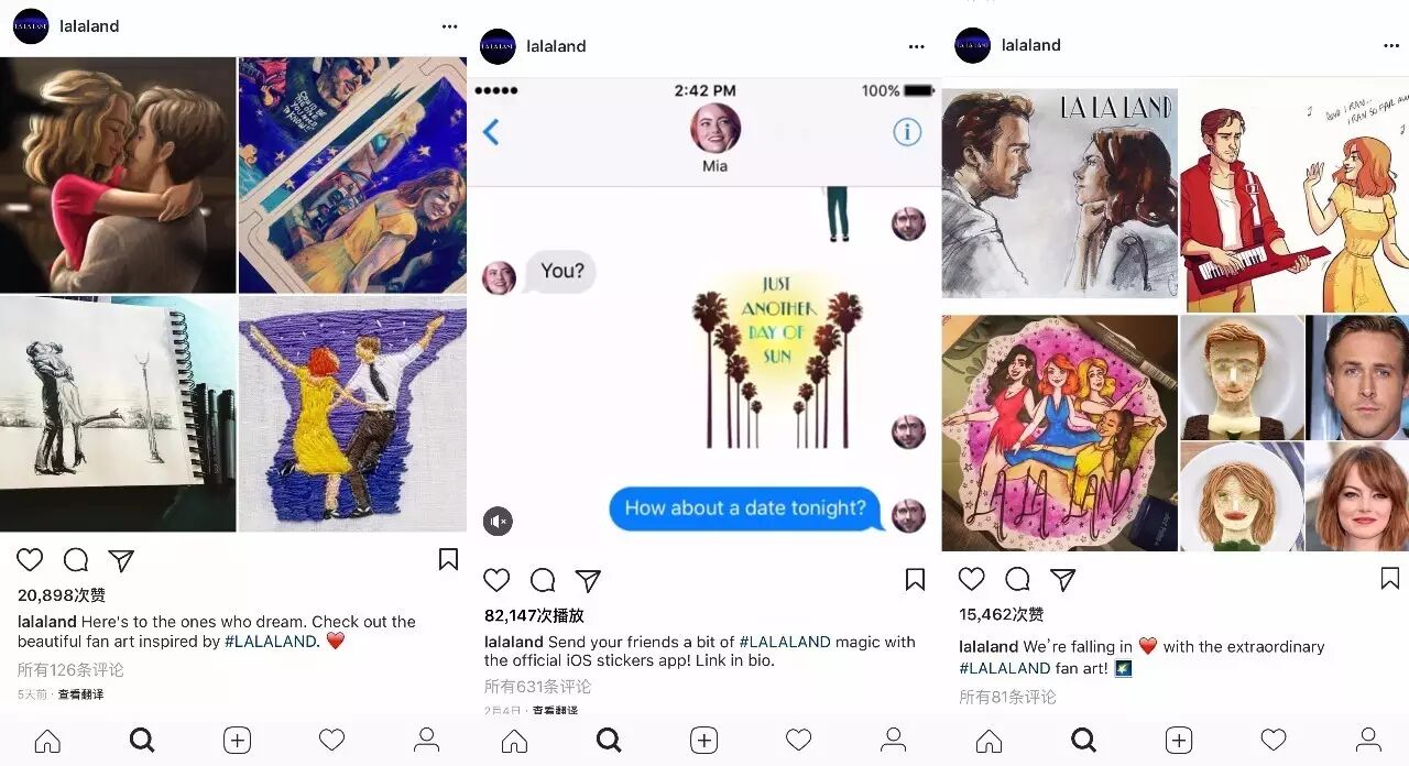 目前《爱乐之城》的官方Ins账号有14.2万粉,发布帖子165条,全是与影片宣发相关的内容。除了传统的宣传海报、预告片发布,该账号还会发布一些适合粉丝传播的内容,例如《爱乐之城》男女主角的唯美插画、创意聊天界面宣传图、恶搞食物等。