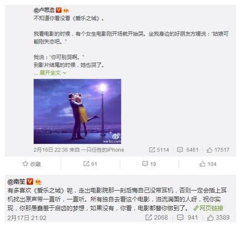 其次,点映之后,无数大V为《爱乐之城》写影评捧口碑,实力加分。