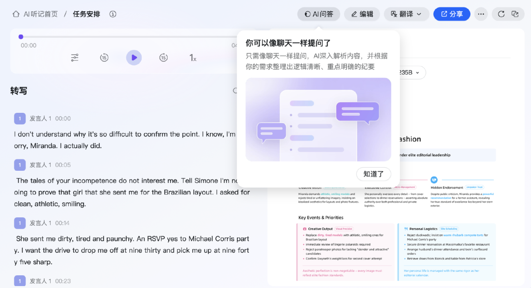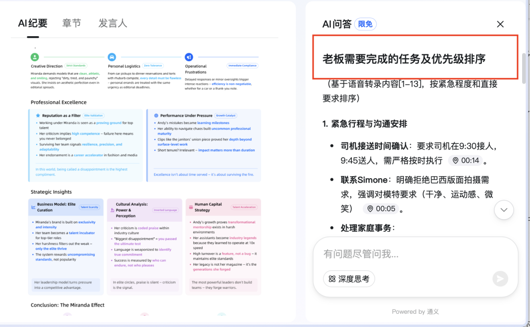 AI听记先完成了语音转写,并生成一版完整的文字速记。在此基础上,我点击AI问答,并抛出问题:“列出Miranda布置的任务,并按任务轻重缓急排序”。