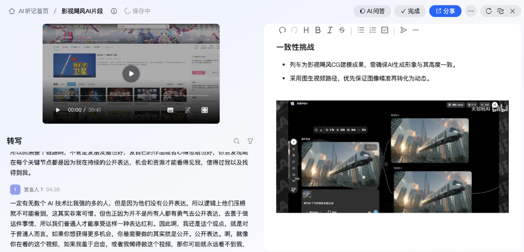 前段时间,B站上有一个关于“影视飓风AI高能片段拆解”的视频,干货很多但时长直接劝退我。这次,我试着用钉钉AI听记来快速获取一下知识。