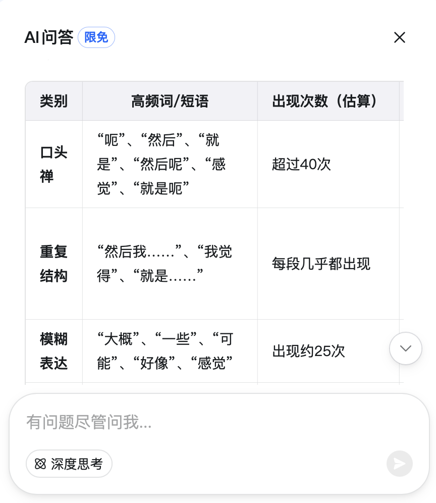 AI迅速统计出了我下意识说了超过40次“然后”“就是”、25次“大概”“好像”等模糊表达,并指出了我在切换话题时习惯性使用的填充词。