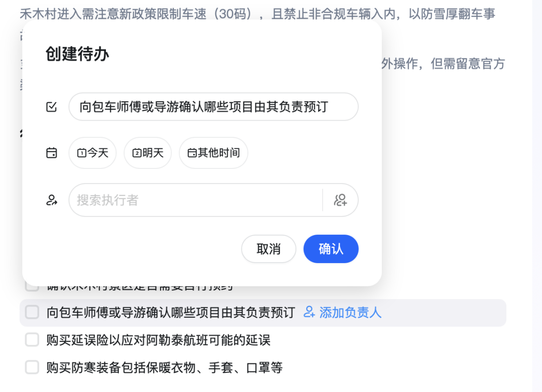 但在短短1小时闲聊结束后,AI听记居然已经给我准备好旅行框架,涉及了行程规划、信息确认、景区预约以及待办事项,我还可以针对某一项任务具体到某个同行人。