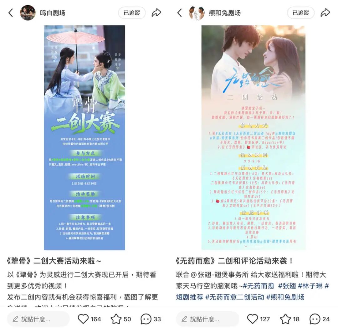 新榜编辑部观察到,这类短剧播出期间多会开启二创激励计划,点赞数靠前的二创内容将获得周边赠礼。