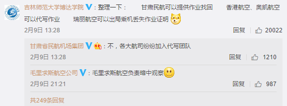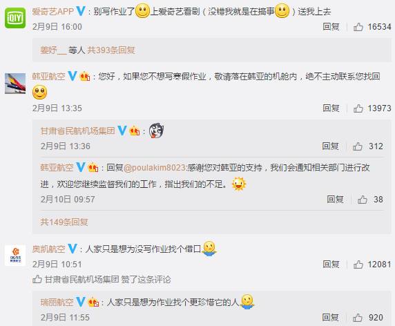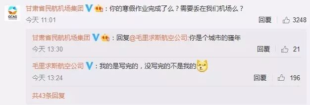 航空公司蓝V们上一次抱团上热搜是寒假结束的时候,@甘肃省民航机场集团 发微博说:“各位旅客,如果您不慎将寒假作业遗失在机场内或机舱内,我们的工作人员会在第一时间帮您找回,请勿无效投诉。这个锅,我们不背!”