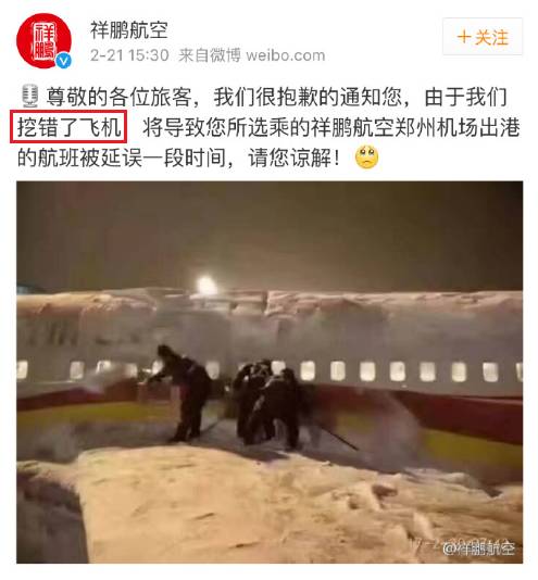 昨天下午@祥鹏航空 发了一条微博,说“由于我们挖错了飞机,将导致您所选乘的祥鹏航空郑州机场出港的航班被延误一段时间”,还配有工作人员正在大雪中“挖”飞机的照片。