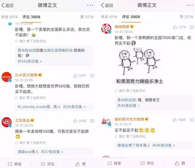 买不起房的梗迎得了粉丝一边倒的力挺,吸引了近300家品牌的“声援”:
