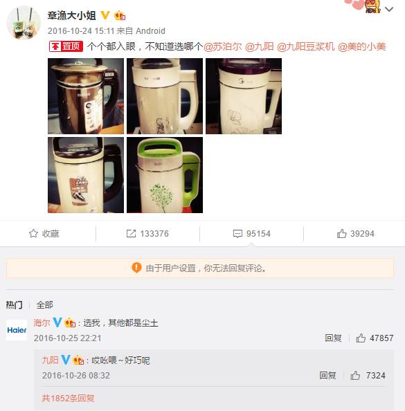 去年10月,微博用户@章漁大小姐 发了条微博说自己不知道该用哪个品牌的豆浆机,这条引来3万多家商家前来评论的神微博下,@海尔 力压群芳位列点赞榜首。