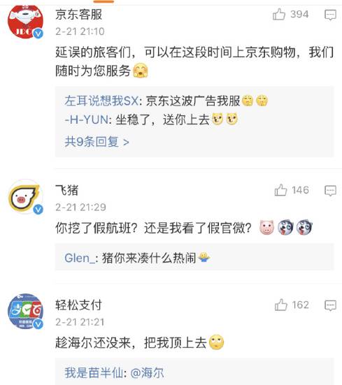 @京东客服、@飞猪、@轻松支付等一大波眼熟的官微也纷纷出现在评论区热评里。