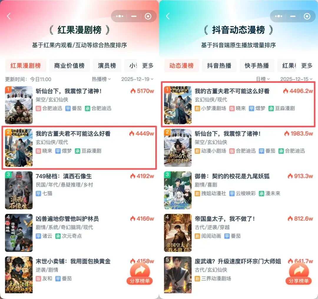 而这,便出自近期连续多日位居抖音动态漫榜首的《我的古董夫君不可能这么好看》(以下简称为《古董夫君》),也是本期我们要拆解的作品。