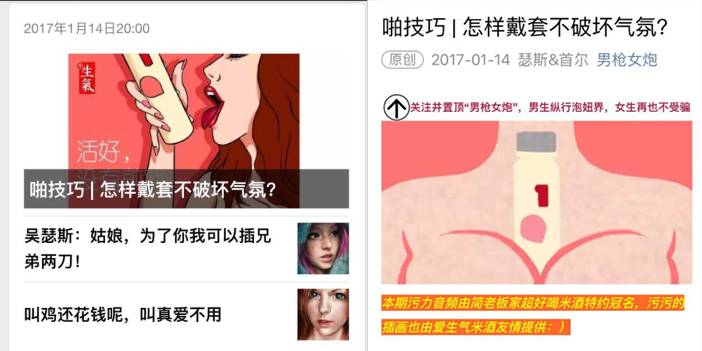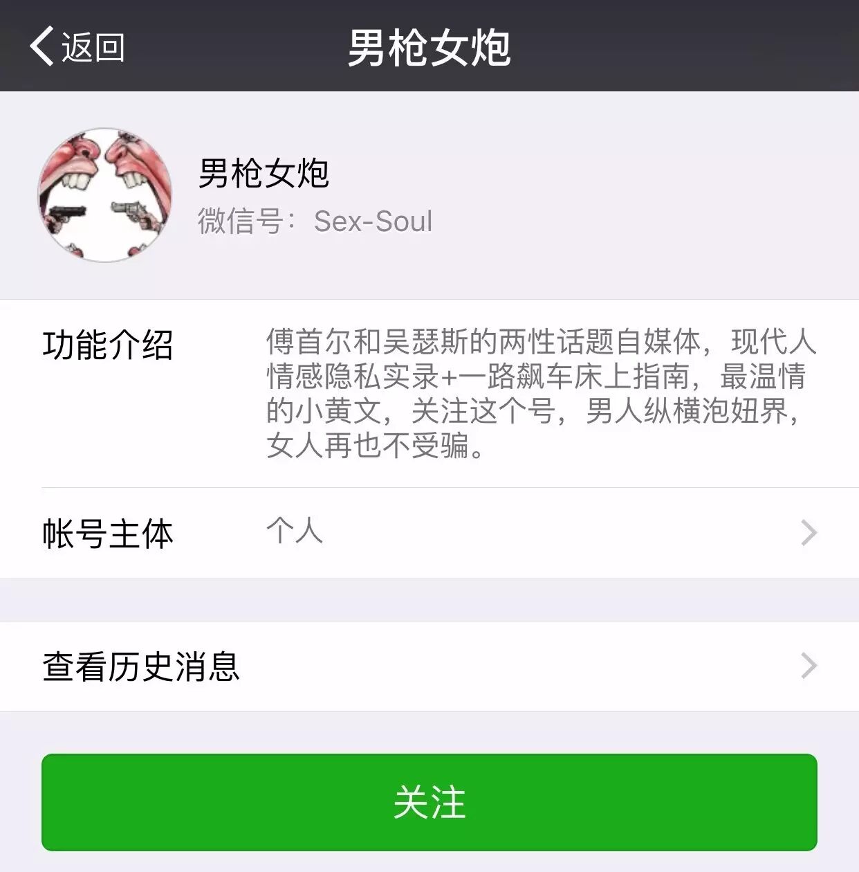 男枪女炮:当红情感类微信公众号之一,男女两位联合创始人从两性话题入手,解构当代男女非典型关系和情感状态,微信推文观点尖锐犀利且行文风格充满挑逗和大尺度内容,深受都市男女文青追捧。