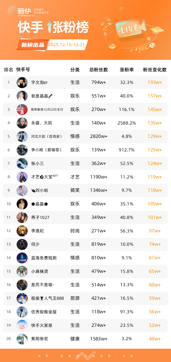 依托新榜旗下快手数据工具“新快”,新榜推出「快手涨粉榜」,本次统计周期为2025年12月15日到2025年12月21日。
