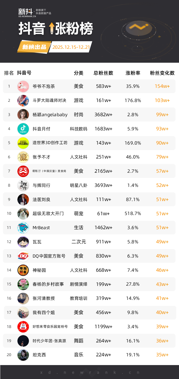 依托新榜旗下抖音数据工具“新抖”,新榜推出「抖音涨粉榜」,每周一期。本次统计周期为2025年12月15日到2025年12月21日。