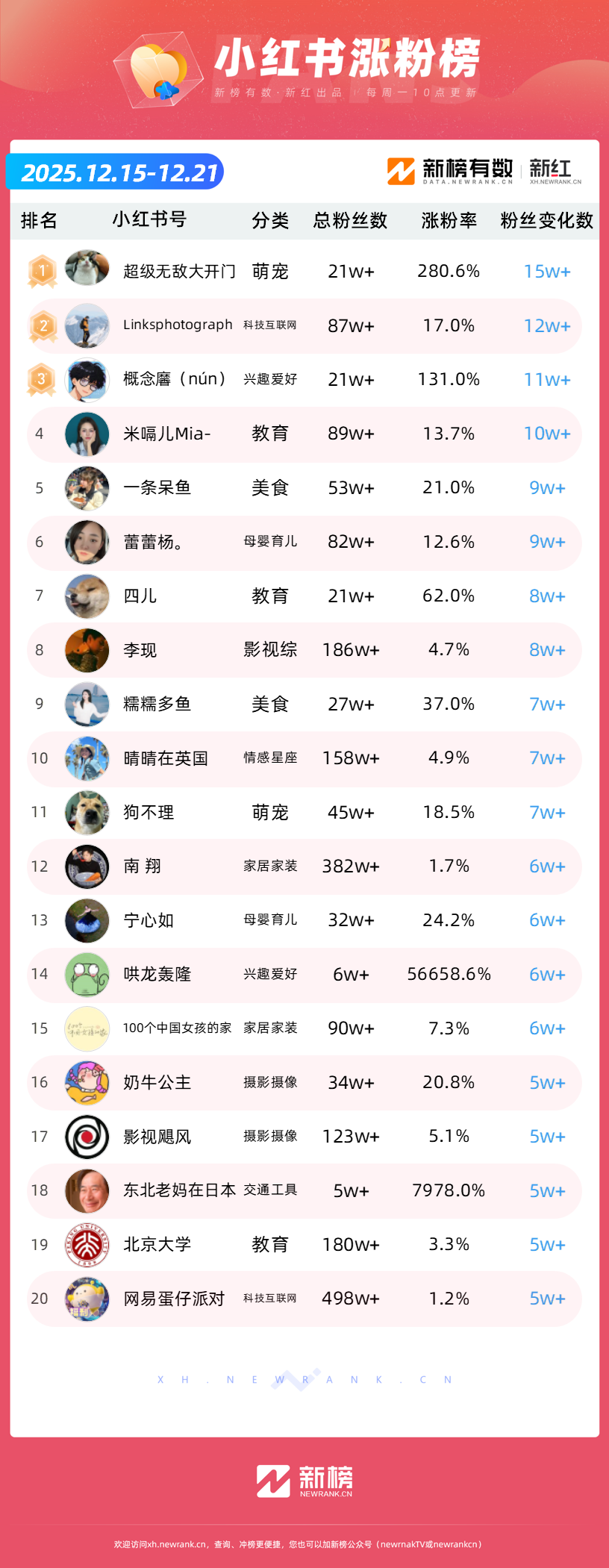 依托新榜旗下小红书数据工具“新红”,新榜推出「小红书涨粉榜」,本次统计周期为2025年12月15日到2025年12月21日。