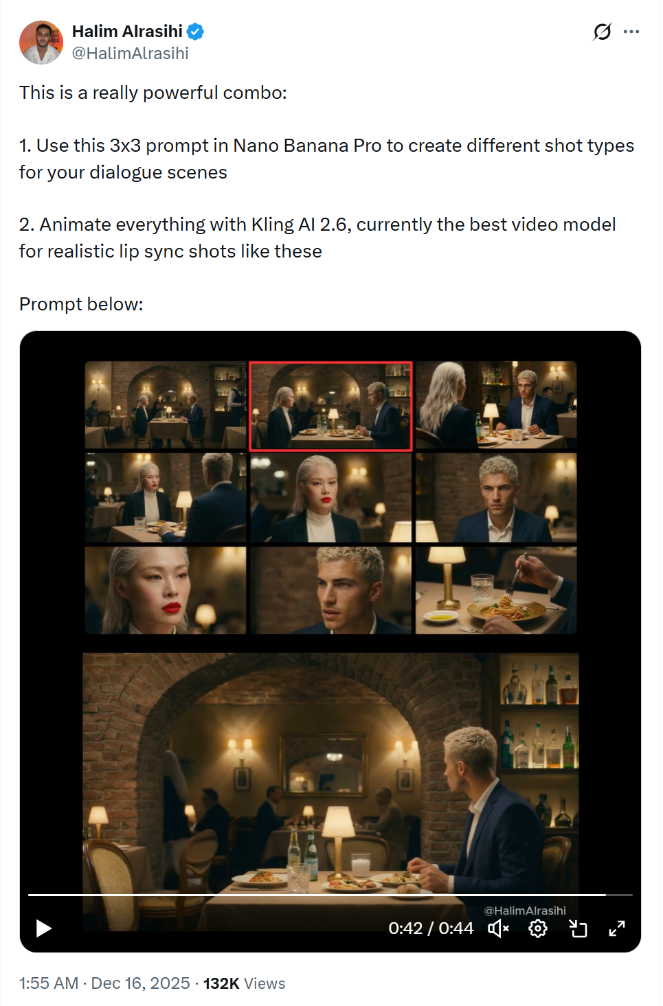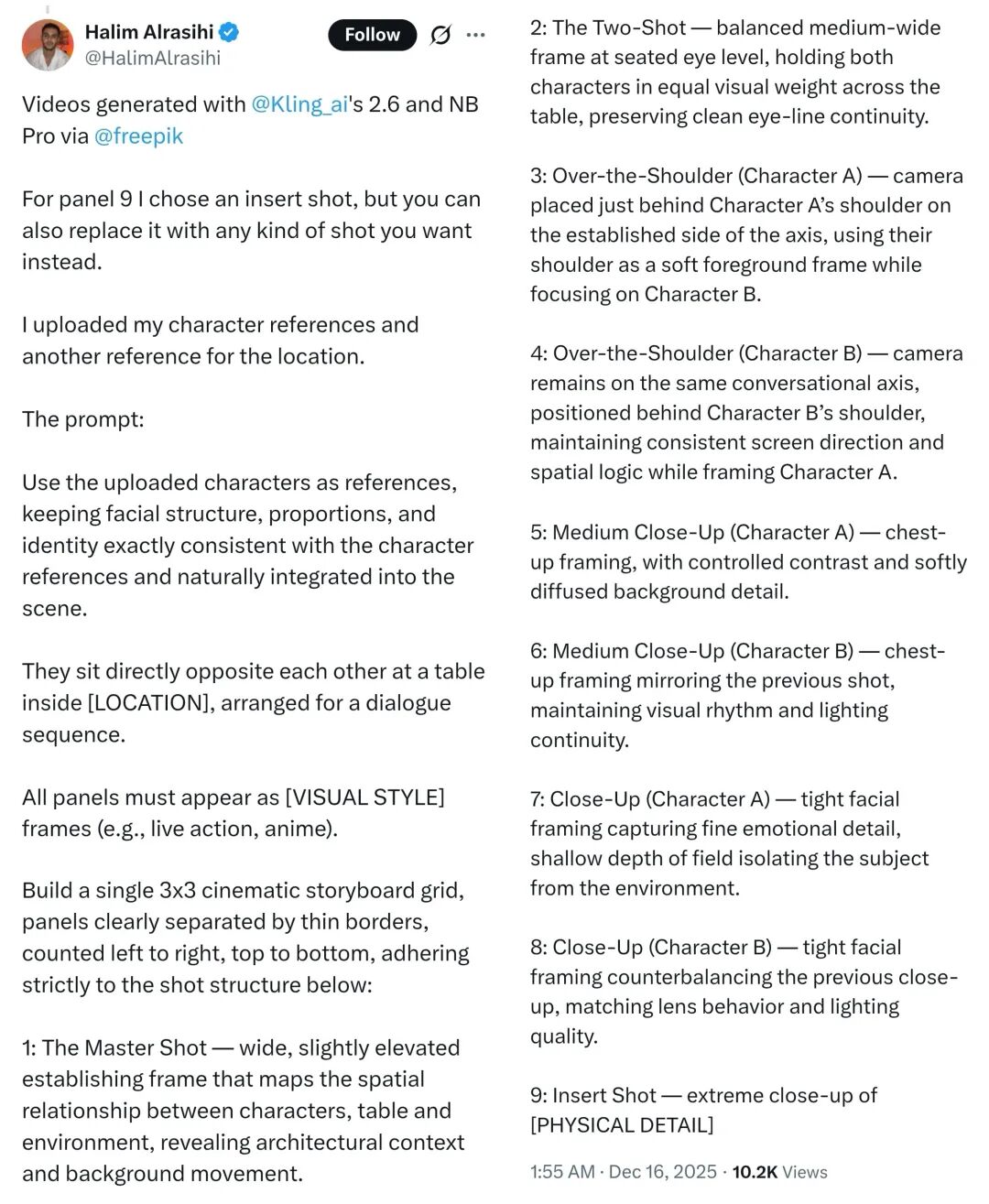 12月16日,海外博主“Halim Alrasihi”分享了一个好用的AI视频生成工具组合:用Nano Banana Pro一键生成不同的镜头类型,然后用可灵AI 2.6来制作镜头组接的动画。