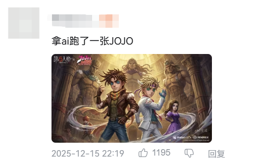 有网友在评论区分享了一张AI自制的《第五人格》与《JOJO的奇妙冒险》的联动海报,并附上了提示词模板。