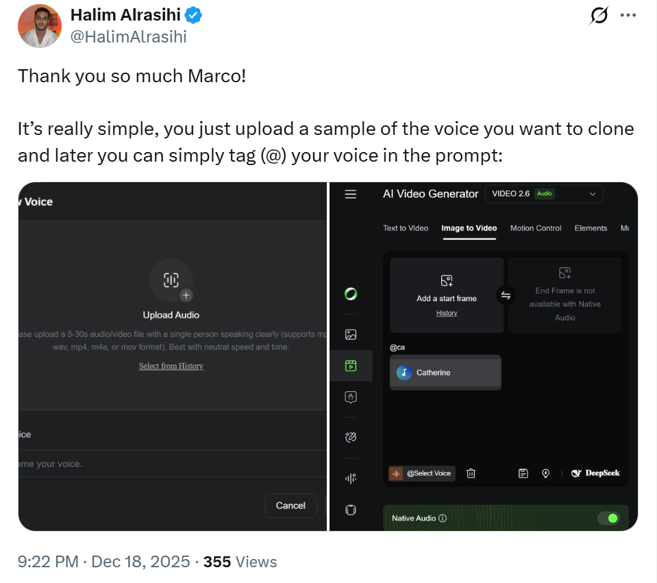 在角色的声音克隆和一致性问题上,“Halim Alrasihi”提到,只需将一段音频样本上传到可灵AI作为参考,然后在提示词中@你的声音(即音频样本)就可以实现口型同步和角色声音的稳定输出。它的工作原理与Veo 3.1类似,但效果更好。