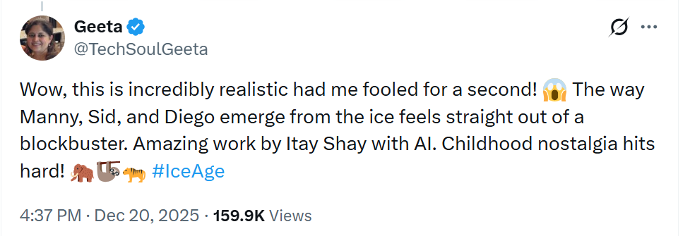 近日,海外博主“Massimo”分享了一段AI制作的《冰河时代》角色被冰封千年后被人们发现的短视频,该视频在X上浏览量突破490万,获赞15万。