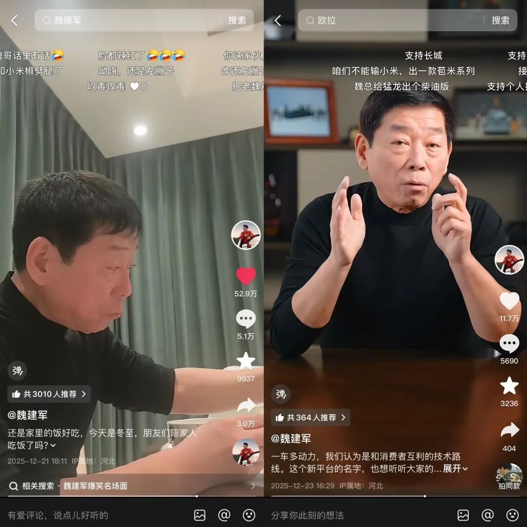 12月30日,“魏建军”发起了《求教起个名挺急的》直播,携资深媒体人吴佩、科技博主Eva,为长城汽车新平台征名。这一举动让原本的企业议题变成全民参与的互动话题,内容的 “共创感”极强,引发网友积极参与互动,收获超8000条命名方案,直播涨粉2.7万。
