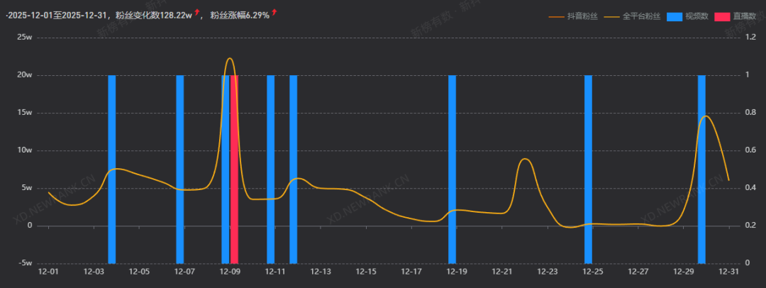 就账号涨粉情况而言,主要有两个涨粉节点,一是前文提到的小米17 Ultra产品抽奖,当日累计涨粉4.7万。其次为12月20日,当日进行了“卢伟冰新品爆料直播”,累计涨粉4万。