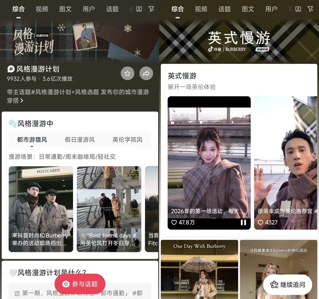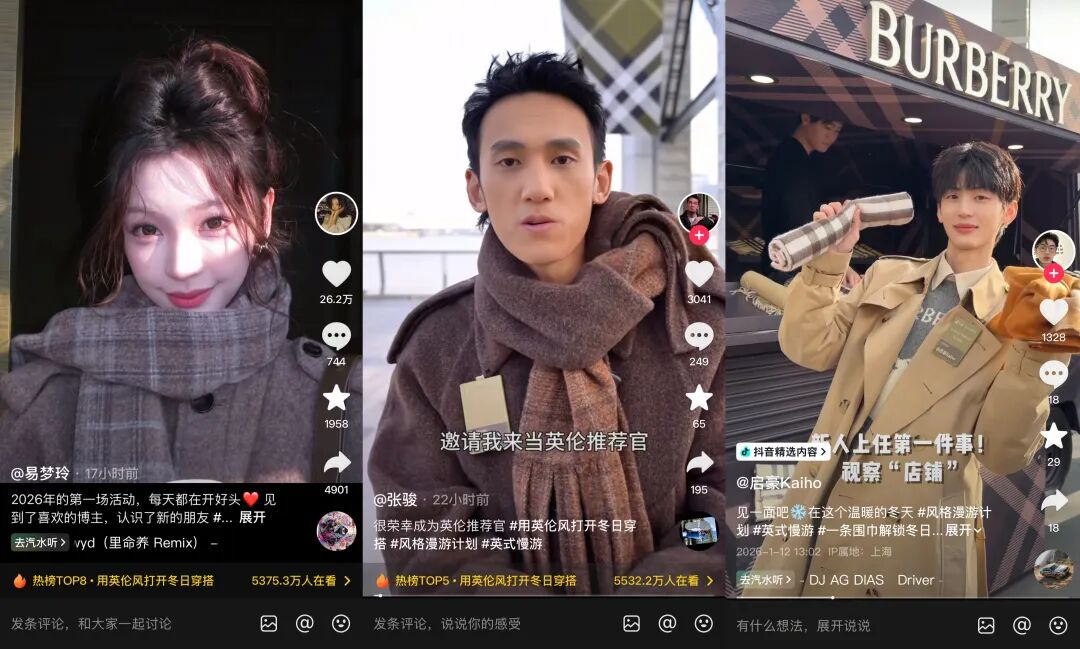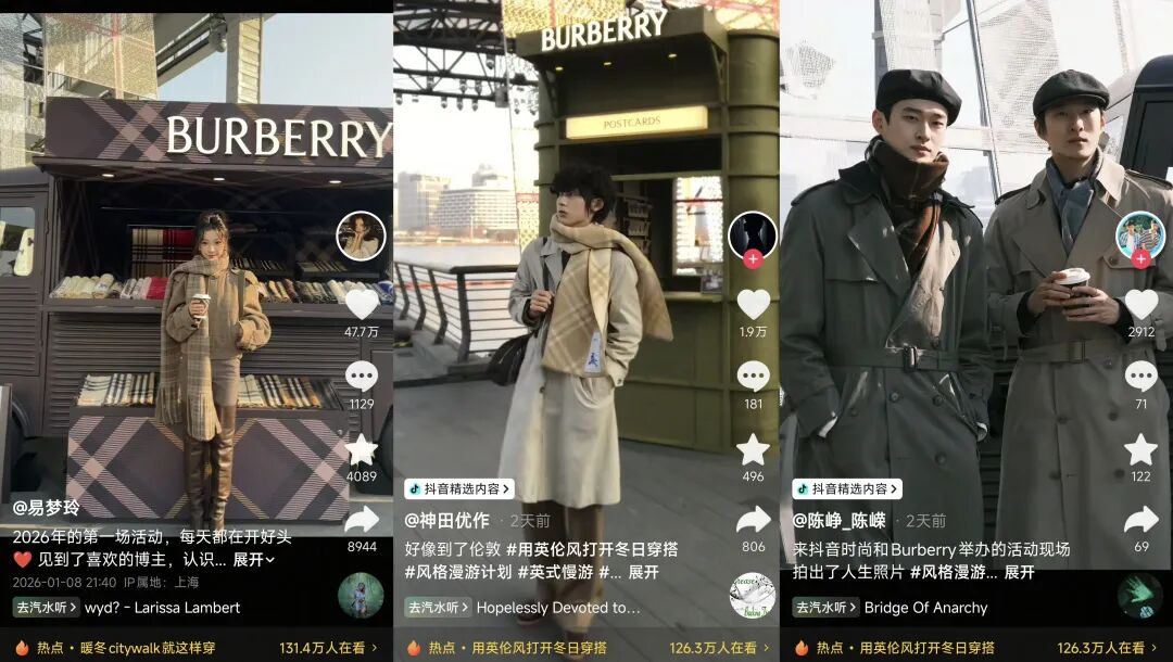 也是在 @易梦玲、@神田优作、@陈峥_陈嵘等抖音时尚创作者的日常化演绎下,不仅<英式慢游>活动成功出圈,还带动了线上线下用户对Burberry的兴趣关注。