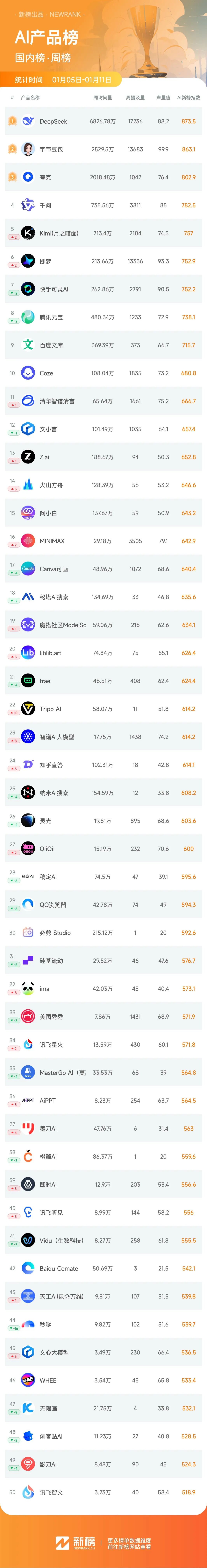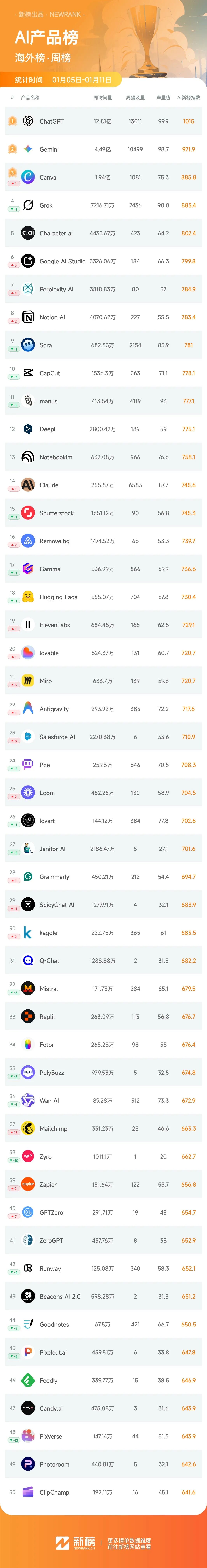 欢迎关注「AI新榜-AI产品榜」,这是由新榜出品的榜单产品,包含月榜和周榜。本期为第70期周榜,统计时间为2026年1月5日-2026年1月11日,榜单分为总榜、国内榜、海外榜。