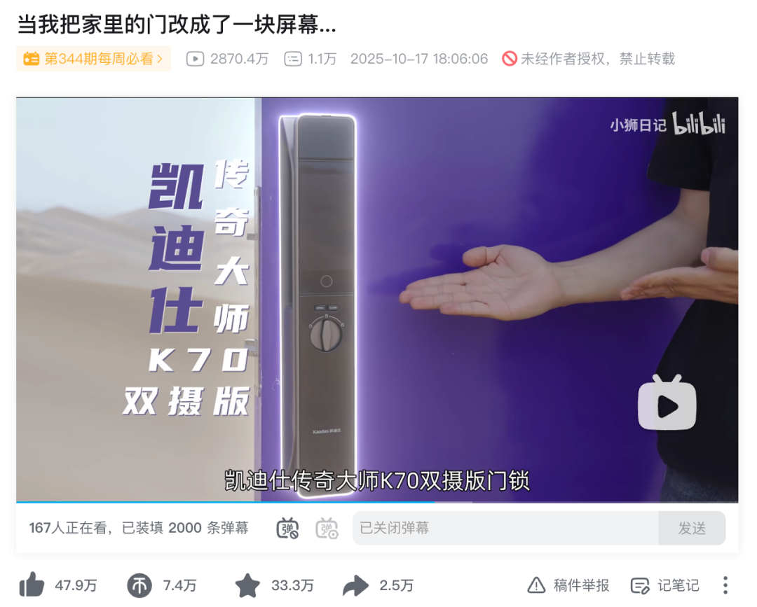 今年10月,UP主“小狮日记”发布了一期主题为《当我把家里的门改成了一块屏幕...》的视频。他通过将自家的大门改造成一块双面显示的屏幕,在不同场景展示不同画面。