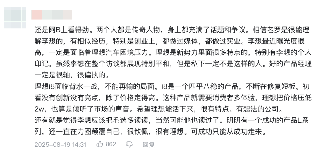 在罗永浩对谈李想的四小时视频播客中,有不少用户分享对于理想汽车品牌与视频播客内容的探讨。