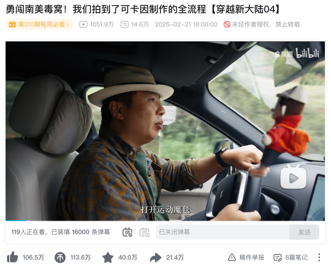 “食贫道”勇闯南美毒窝视频中,驾驶的是理想汽车。视频并未刻意展示车辆性能参数,而是通过长途穿越、复杂路况等真实场景,潜移默化地传递出可靠、安全的产品气质。