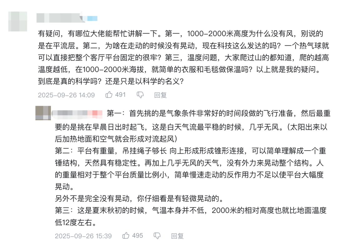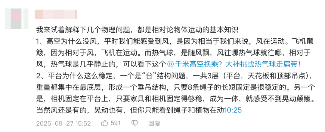 有用户从相对论的角度,讨探讨高空悬浮客厅的可行性;也有观众结合气象学知识,分析温压条件对设备运行的影响。