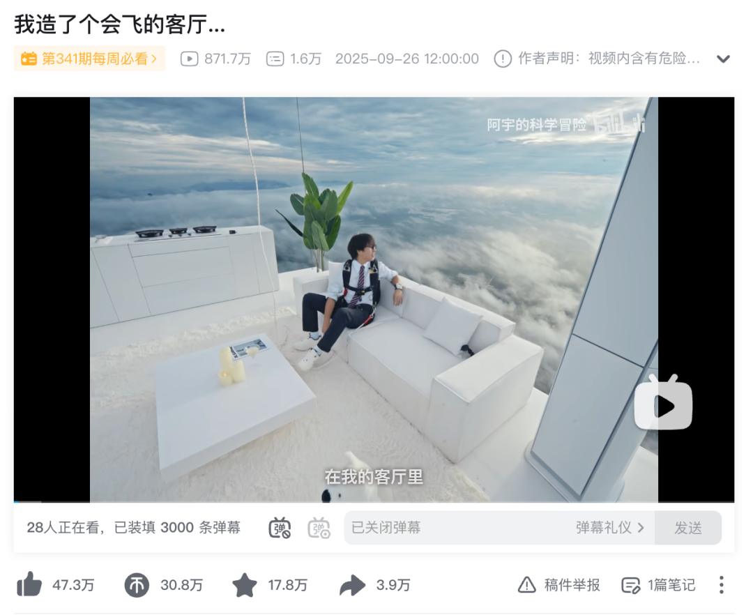 比如视频《我造了个会飞的客厅...》,这是他与家电品牌COLMO的合作。为了体现品牌的“云璃白”配色和产品性能,他将客厅搬到2000米高空,在云层中沉浸式体验产品。