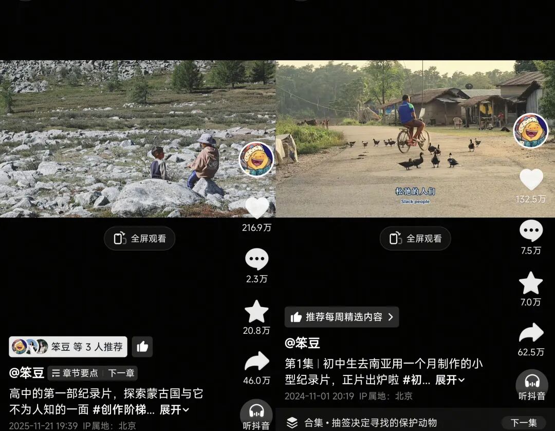 真诚勇敢的记录分享,以及00后独特的人文观察,让“笨豆”的视频在抖音吸引到超100万人观看。一位网友留言:“这真的需要的不止是金钱,还有对探索未知的勇气,真的太厉害了。”