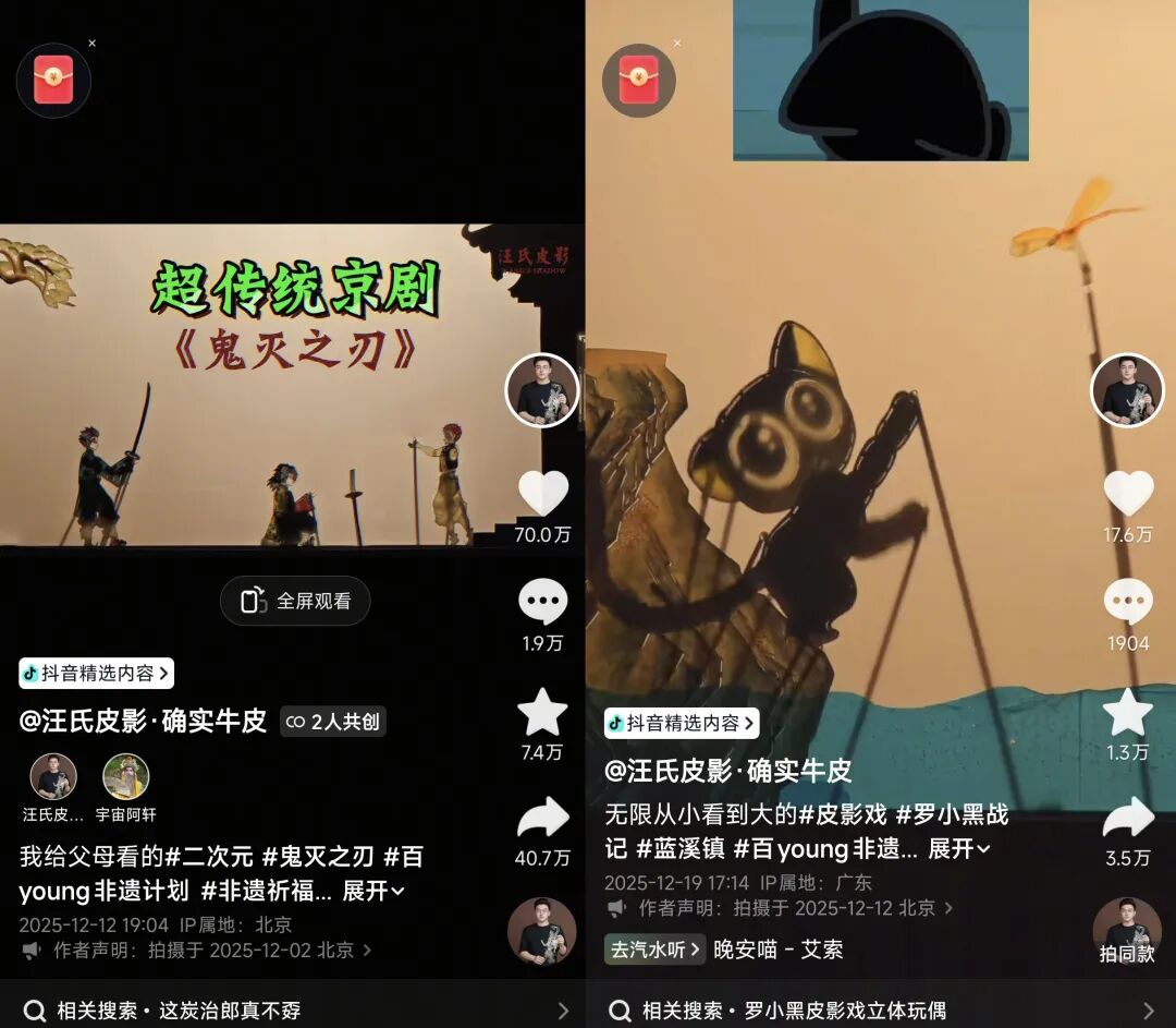 截至发稿前,“汪氏皮影·确实牛皮”和“宇宙阿轩”联合创作的皮影戏版《鬼灭之刃》,在抖音累计获赞超70万。