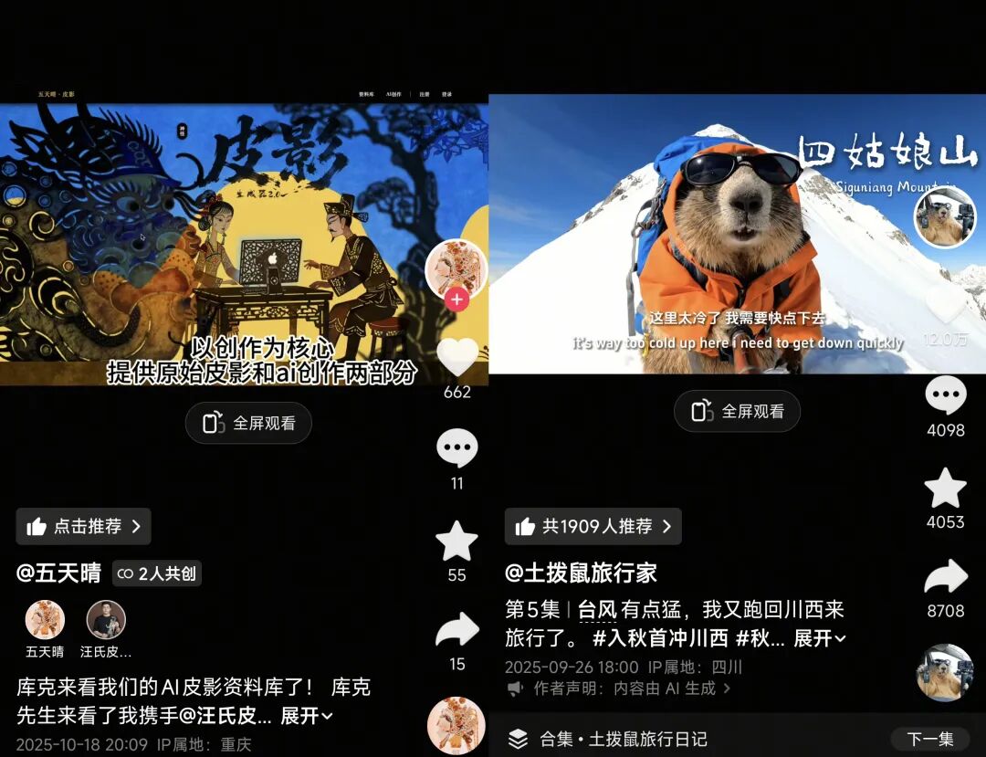 00后创作者“土拨鼠旅行家”因为网友的一句随口提议,化身AI旅行家,先后游览了甘孜、合川、厦门等地。他创作的土拨鼠也成为这波AI浪潮中比较知名的AI形象之一。