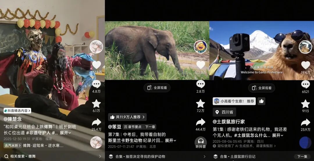 像“陈川同学”这样靠作品飞速破圈的青年创作者,并非个例。如今,抖音兴起一股青年风暴,越来越多青年创作者正在靠作品俘获网友。他们中有的将傩戏和机械舞结合,为传统文化赋予新的活力;有的选择拍摄小型纪录片,用双脚丈量世界;有的化身AI旅行家,用AI走进世界的各个角落。