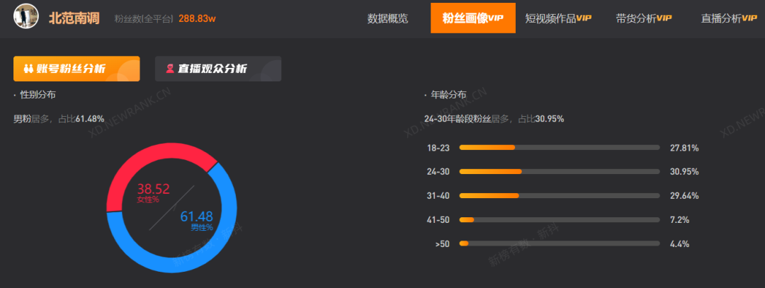 青年创作者向来也是平台吸引年轻用户的重要抓手之一。新榜旗下抖音数据工具新抖显示,“陈川同学”“笨豆”“北范南调”等青年创作者的30岁以下用户占比均在50%以上。