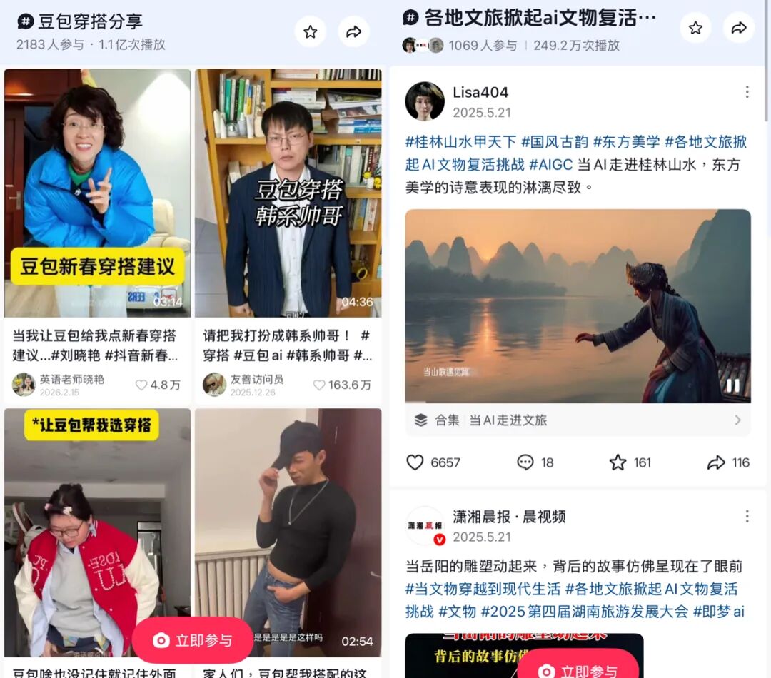 过去一年,从话题播放量超2亿的“豆包教穿搭”,到各地文旅主动接力的“AI复活文物”,网友们早已习惯在抖音平台,通过创作AIGC内容、在评论区交流互动的方式,表达对新技术的感受。