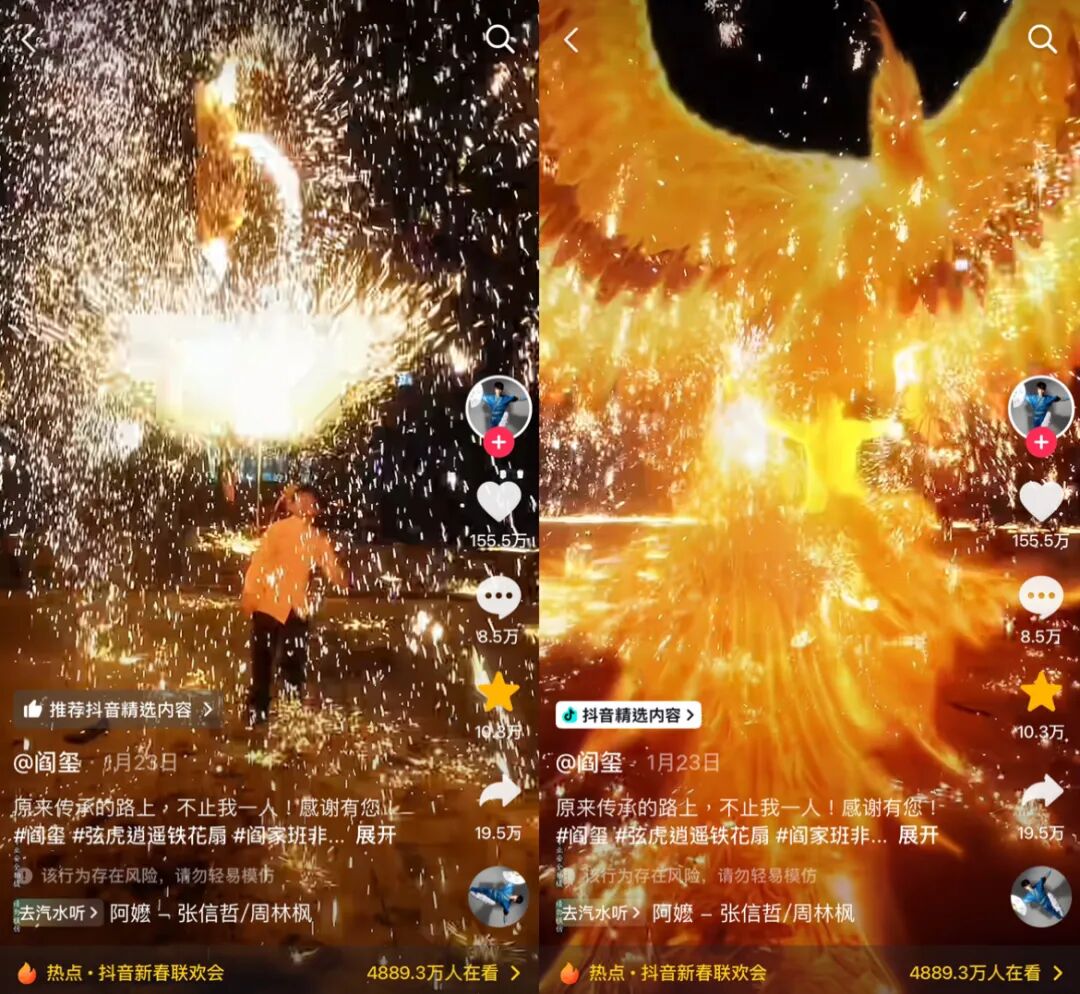 “逍遥铁花扇”的原创作者@阎玺 ,带着阎家班非遗火技登上川渝春晚;最早发布茶盘制作视频的@山白 也打破次元壁,出现在卫视晚会中。