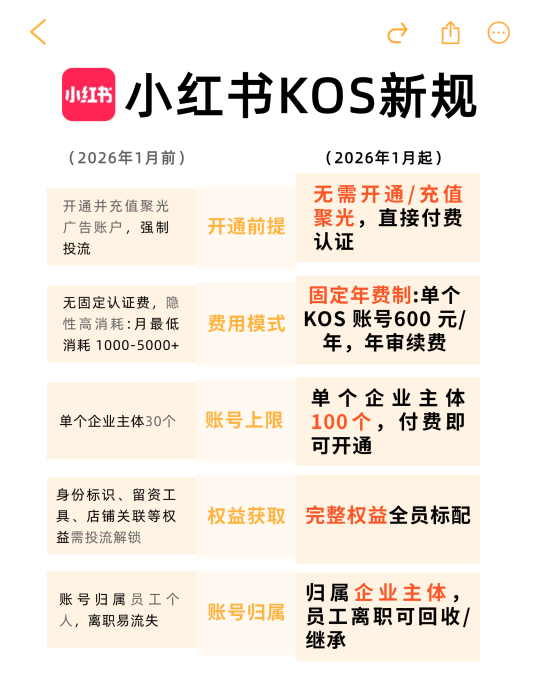 而KOS热潮仍在持续加码。2026年1月,小红书开始调整KOS政策,取消强制广告投流门槛,单个主体可开通上限提升至100个账号,并改为按年付费认证模式。门槛更低、规则更透明,以此吸引更多品牌与企业布局。