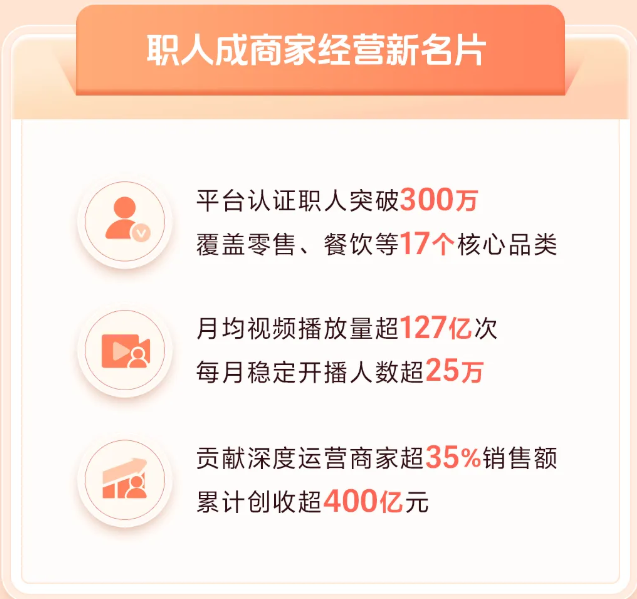 ● 抖音“职人”群体(即KOS)也在快速崛起,认证“职人”已超300w,覆盖零售、餐饮等17个行业,月均视频播放量超127亿次,累计创收突破400亿元。......