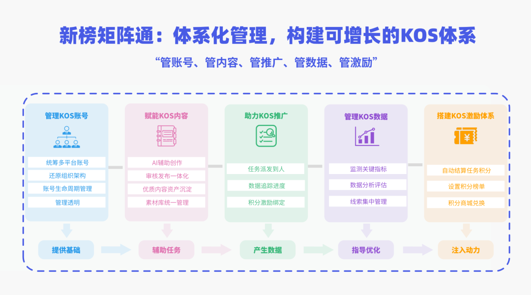 新榜矩阵通立足企业KOS运营痛点,以数字化管理平台为核心,为企业提供更专业高效的KOS数字化管理解决方案。通过“管账号、管内容、管推广、管数据、管激励”五大核心能力,打通KOS运营全流程,破解管理失序、执行低效、动力不足三大顽疾,让每一个KOS账号都成为品牌增长的有效抓手。